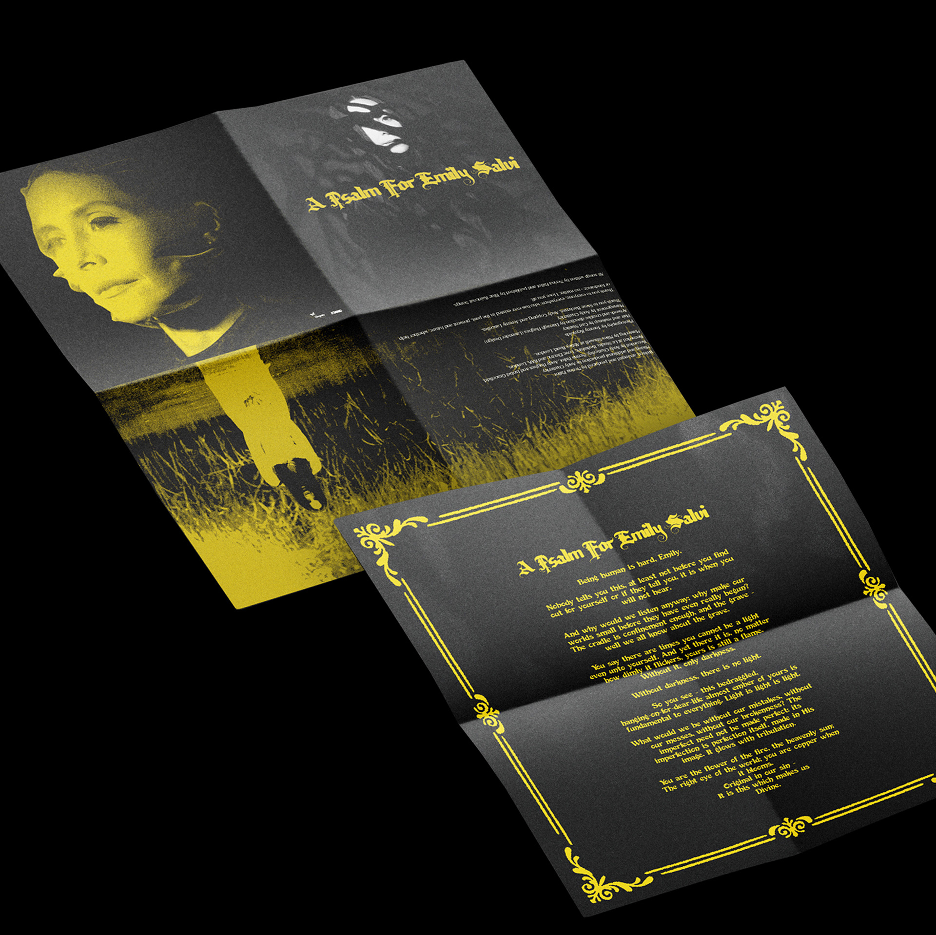 The CD design utilizes a classic jewel case, selected to provide a timeless aesthetic and effectively frame the artwork. The vibrant yellow elements were carefully balanced with dark shadows. A double-sided fold-out poster was included, allowing the accompanying ‘Psalm’ to unfold elegantly.