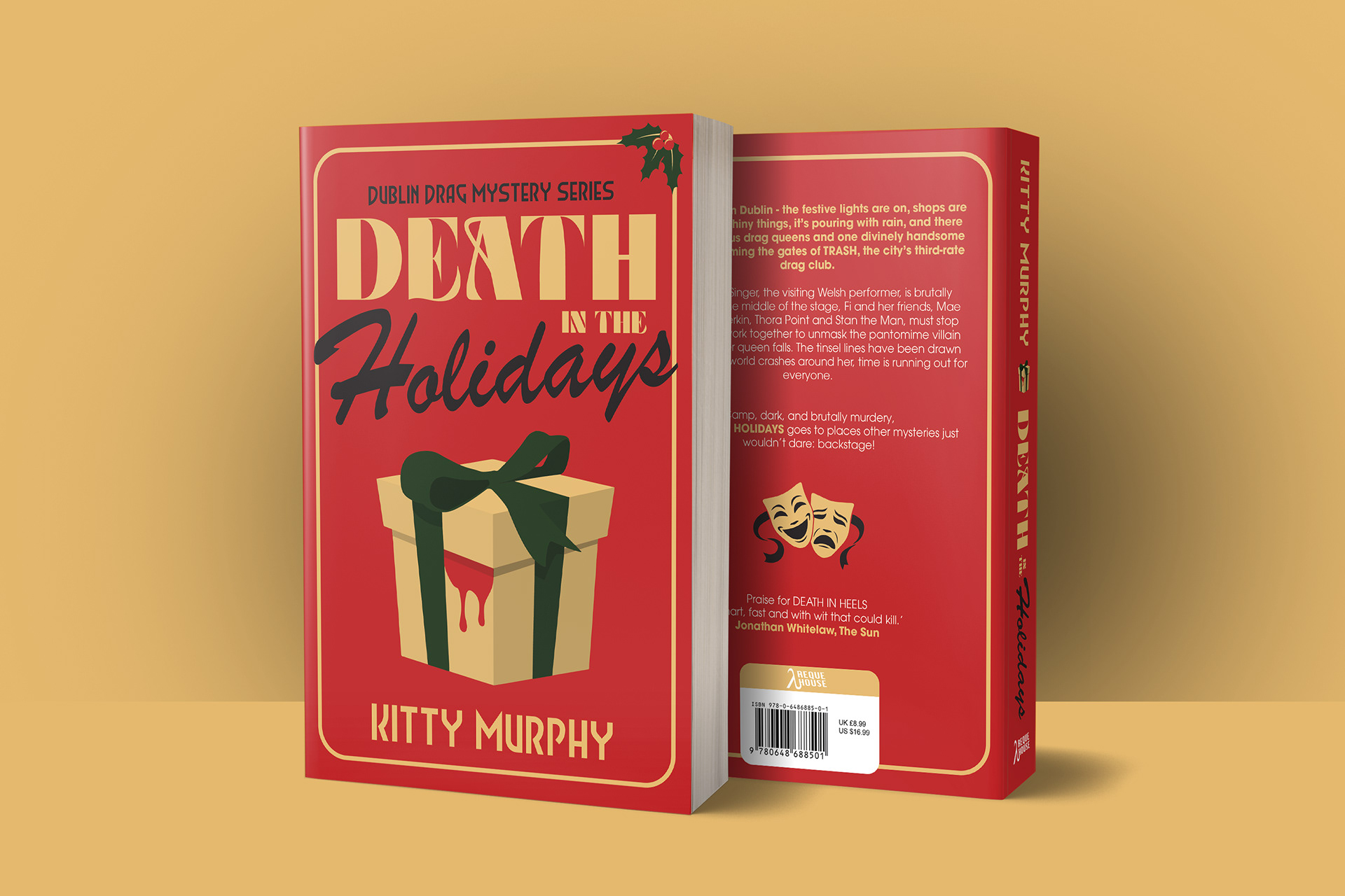Book sleeve design for the third installment of Kitty Murphy’s Dublin Drag Mysteries series, featuring bold, thematic visuals that capture the essence of the story and its vibrant atmosphere.